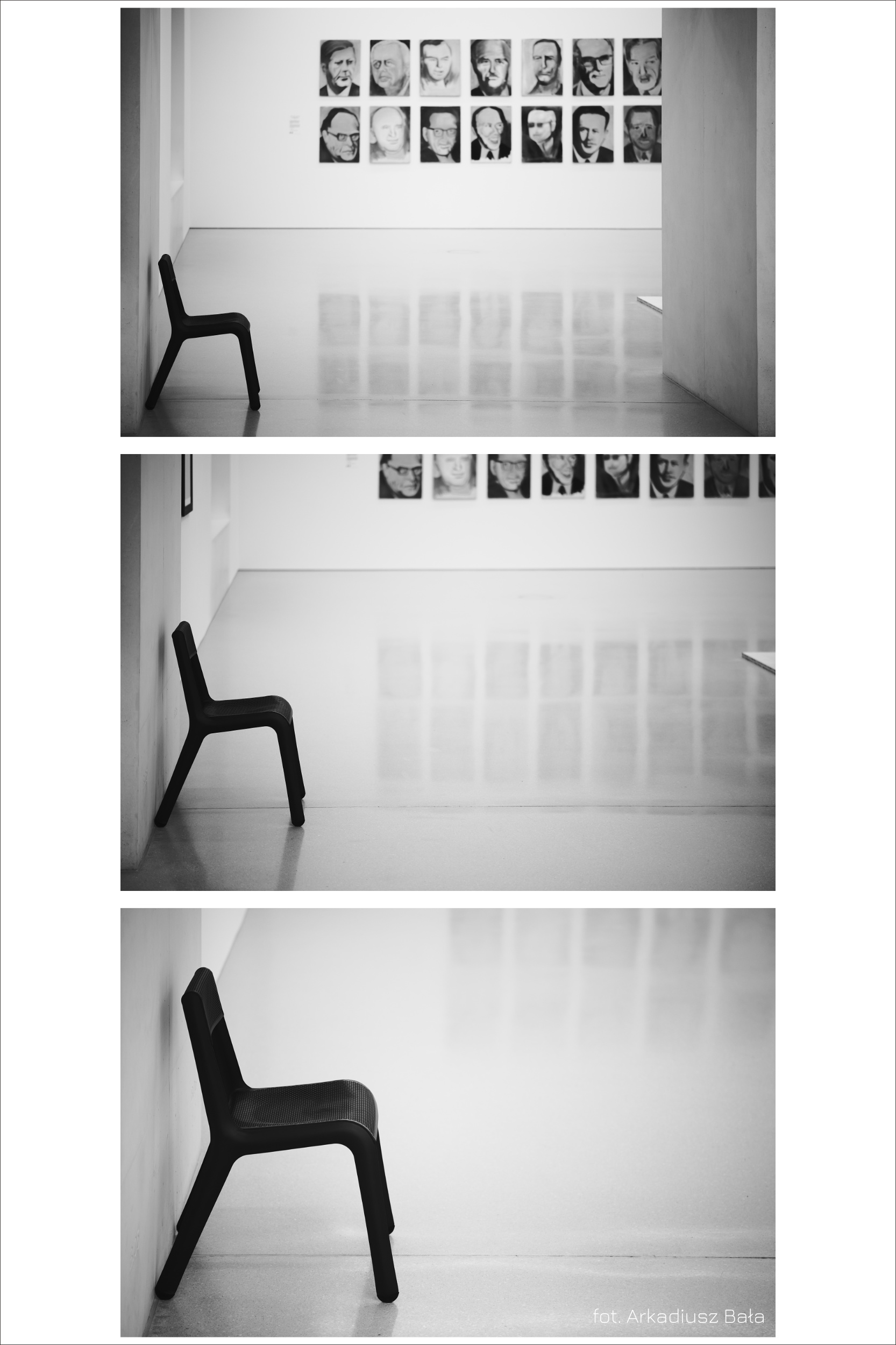 (Museum Triptych with Modern Chair and Portraits in the Background)