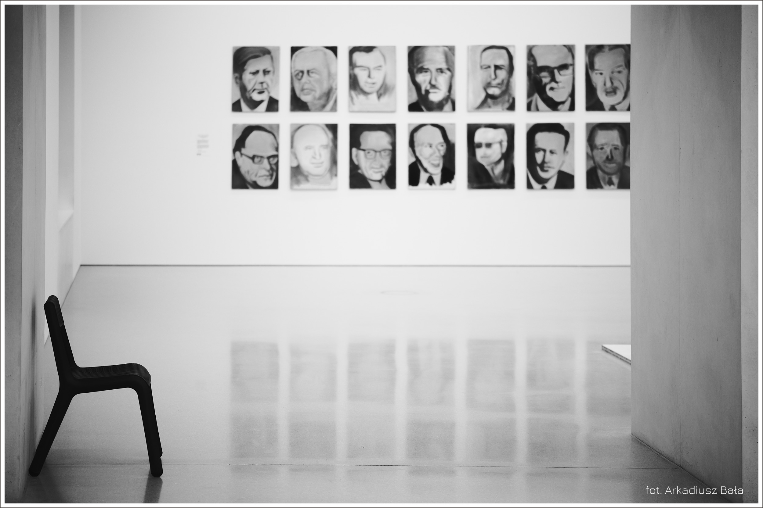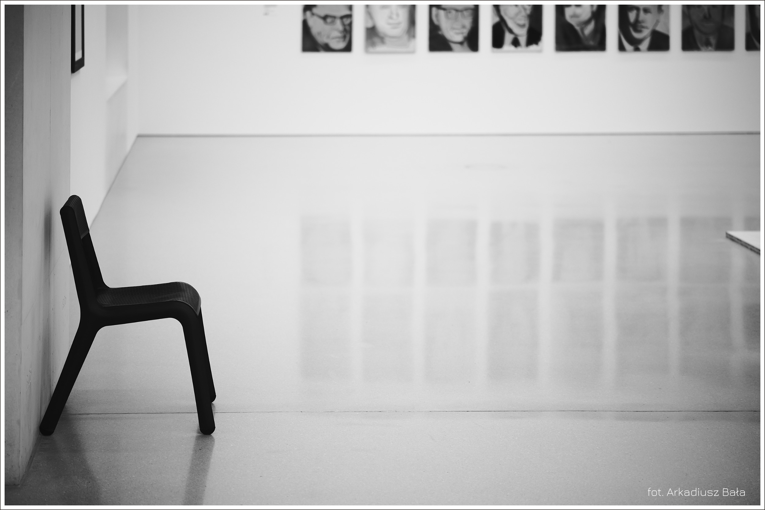 Tryptyk Muzealny z Krzesłem Współczesnym i Portretami w Tle